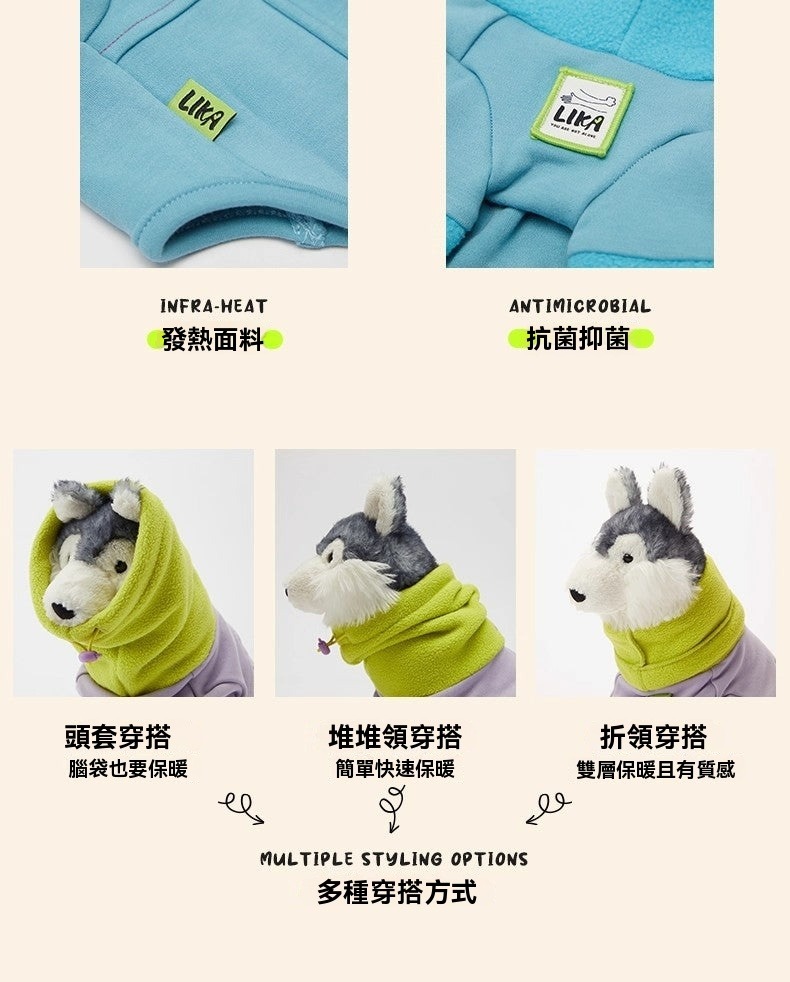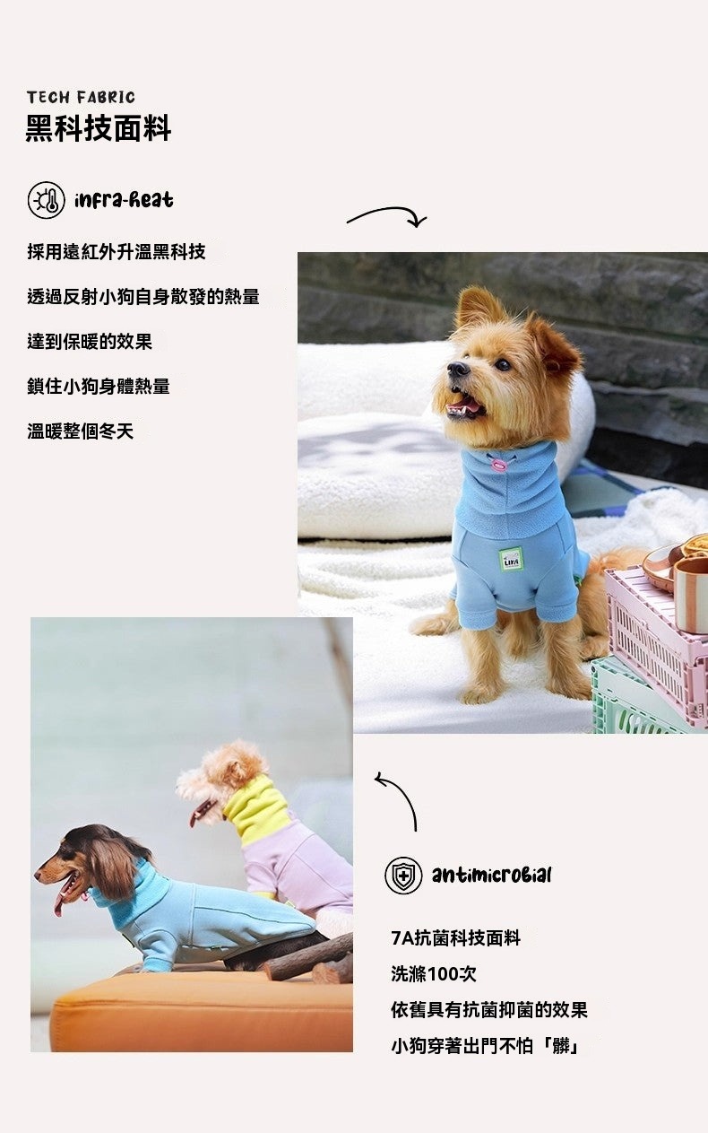 • Isolierendes Ferninfrarotgewebe: reflektiert die Körpertemperatur des Hundes und sorgt so für langanhaltende Wärme.