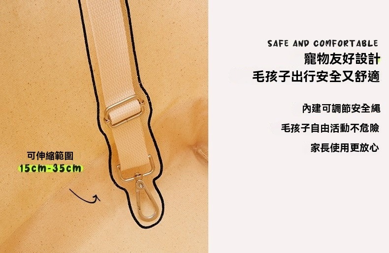 • 寵物友善安全細節:可調節的內安全帶和側切口,讓寵物舒適地探頭出行