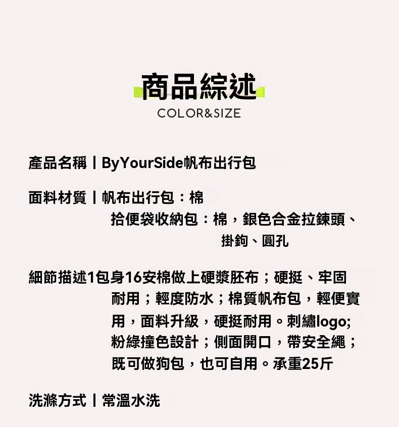 •細節描述:包身16安棉做上硬漿坯布;硬挺、牢固耐用;輕度防水;棉質帆布包,輕便實用,布料升級,硬挺耐用。刺繡logo;粉綠撞色設計;側面開口,帶安全繩;既可做狗包,也可自用。承重25斤